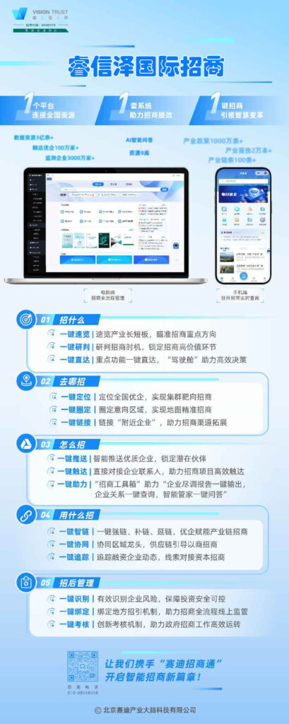 “招商通”以人工智能、大数据等手段助力解决招商工作“五个招”的问题,即“招什么、去哪招、怎么招、用什么招,招后管理”,助力地方招引质效双提升。
